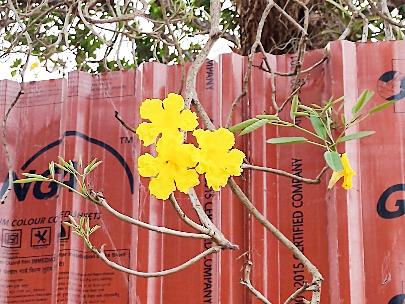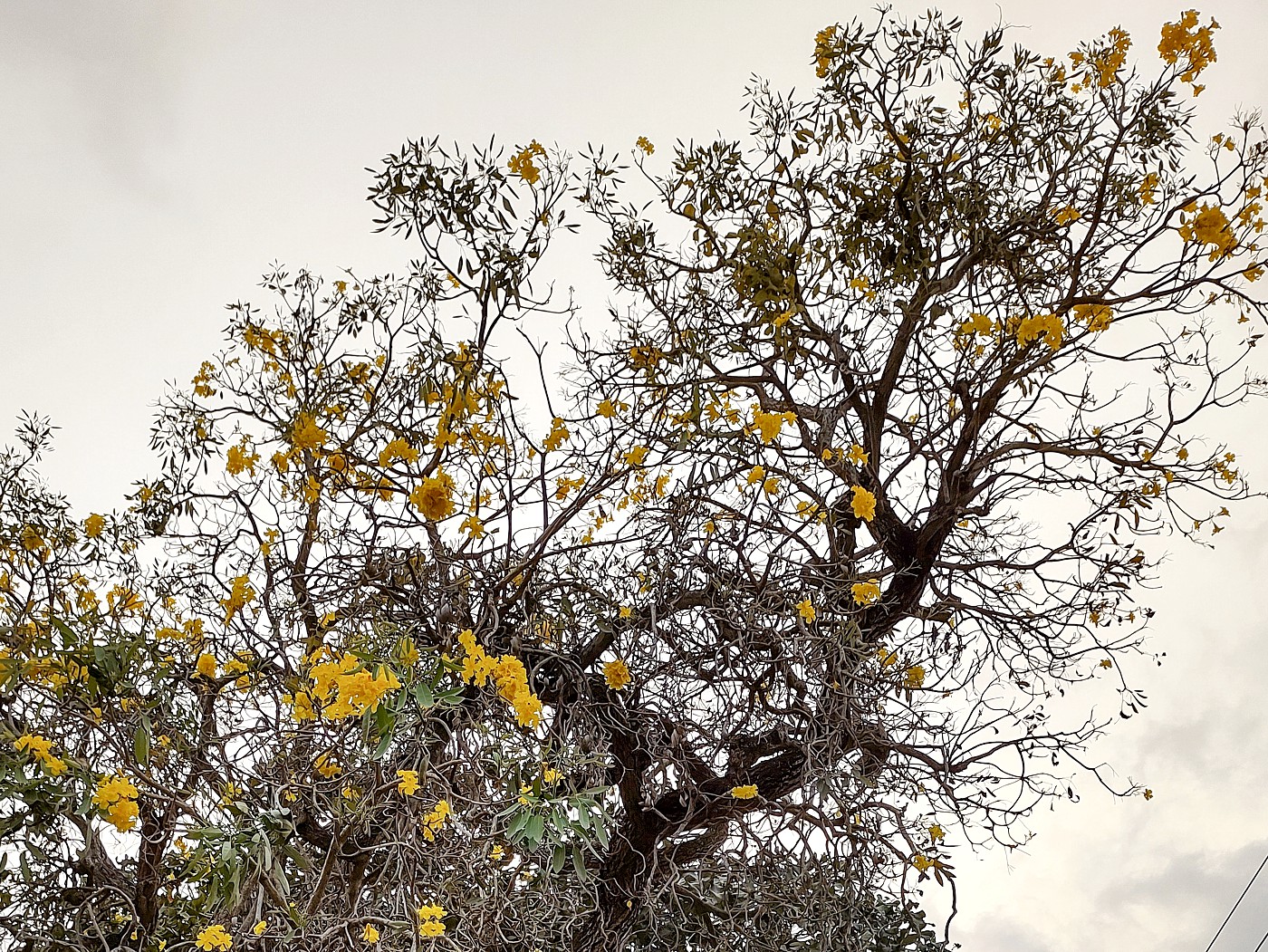 A quick online search confirmed the identity of this striking tree — Tabebuia aurea, commonly known as the Silver Trumpet Tree, Caribbean Trumpet Tree, or Yellow Tabebuia.