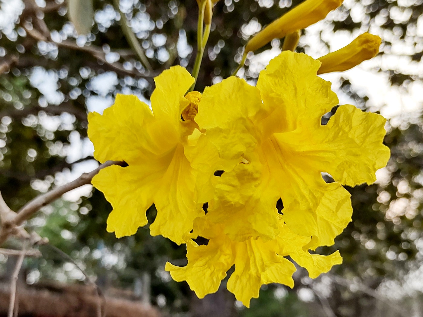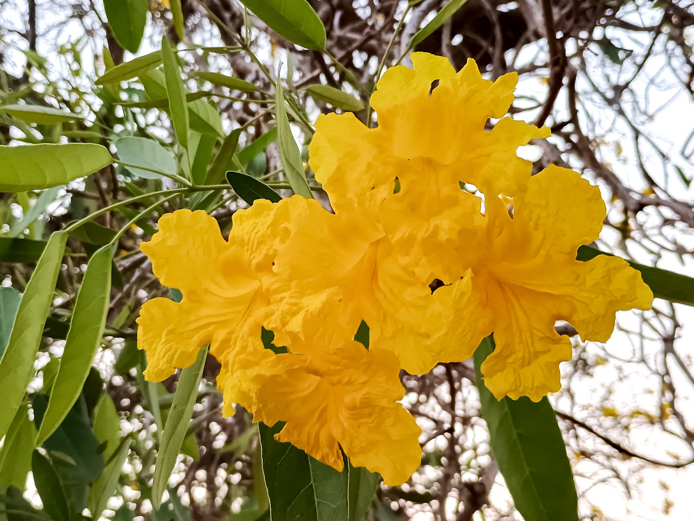 The real spectacle, however, occurs during the flowering season. Usually coinciding with the dry months, the tree produces dense clusters of large tubular flowers with gently flaring, slightly ruffled edges. The blooms range in colour from rich golden yellow to pale yellow or cream and often appear when the tree has shed much of its foliage, making the display even more dramatic.