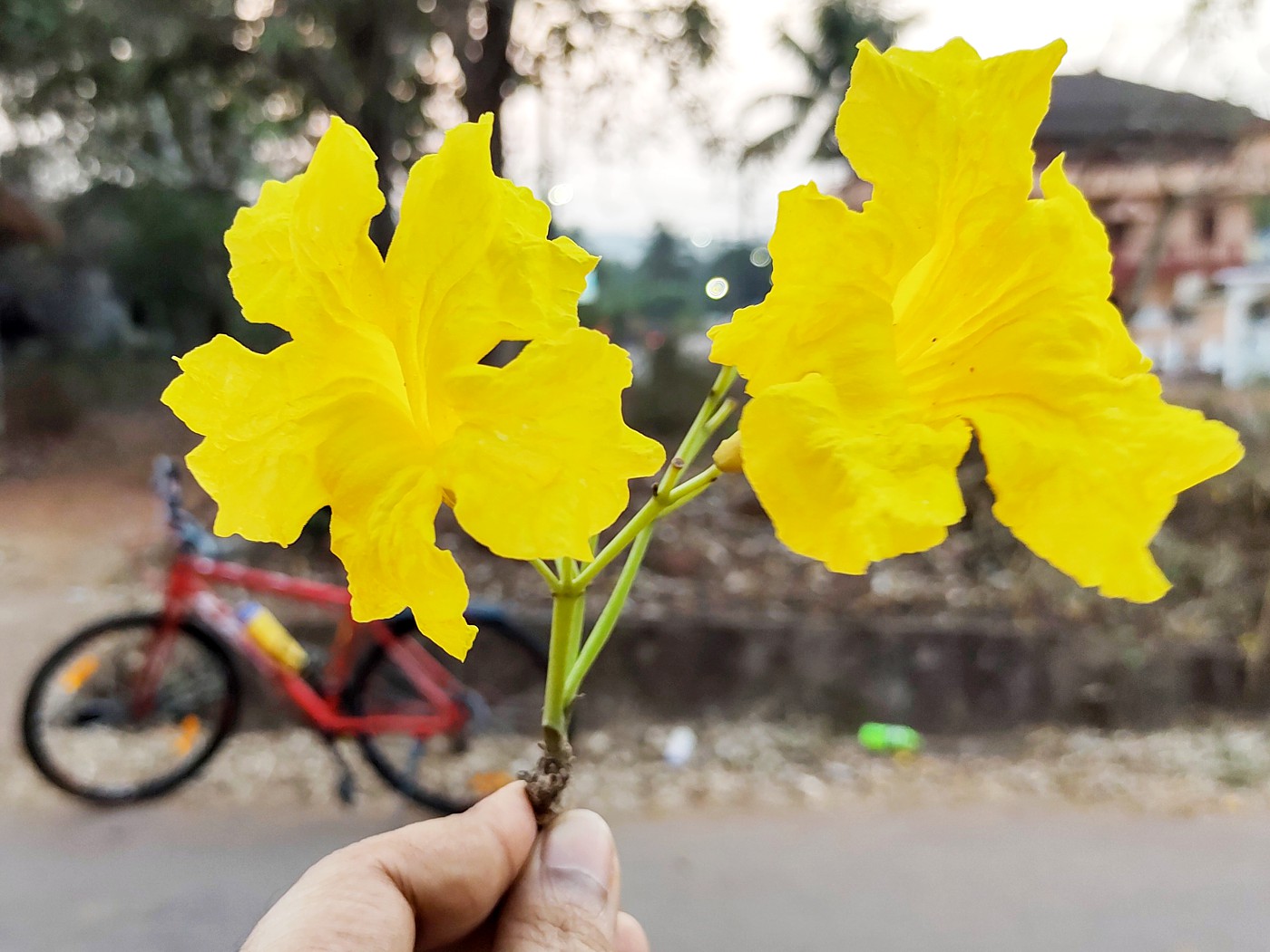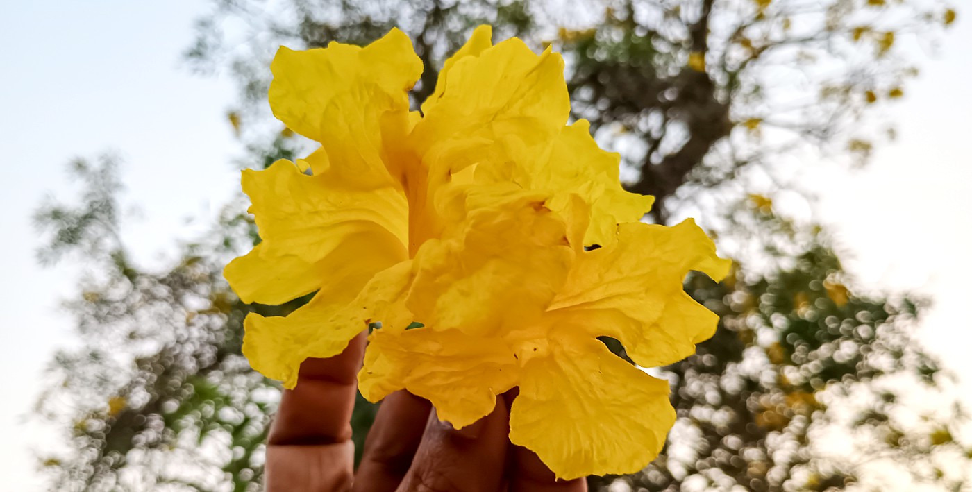 Summer in Goa often slips in quietly, but the landscape soon begins to reveal its seasonal spectacles. As the days grow hotter, several flowering trees burst into bloom, briefly transforming dusty village roads into corridors of colour. On a recent cycling ride through the quiet village of Maina, one such unexpected sight made me slow down and look twice — a tree crowned with a dazzling canopy of golden-yellow, trumpet-shaped flowers glowing against the fierce summer sky.
