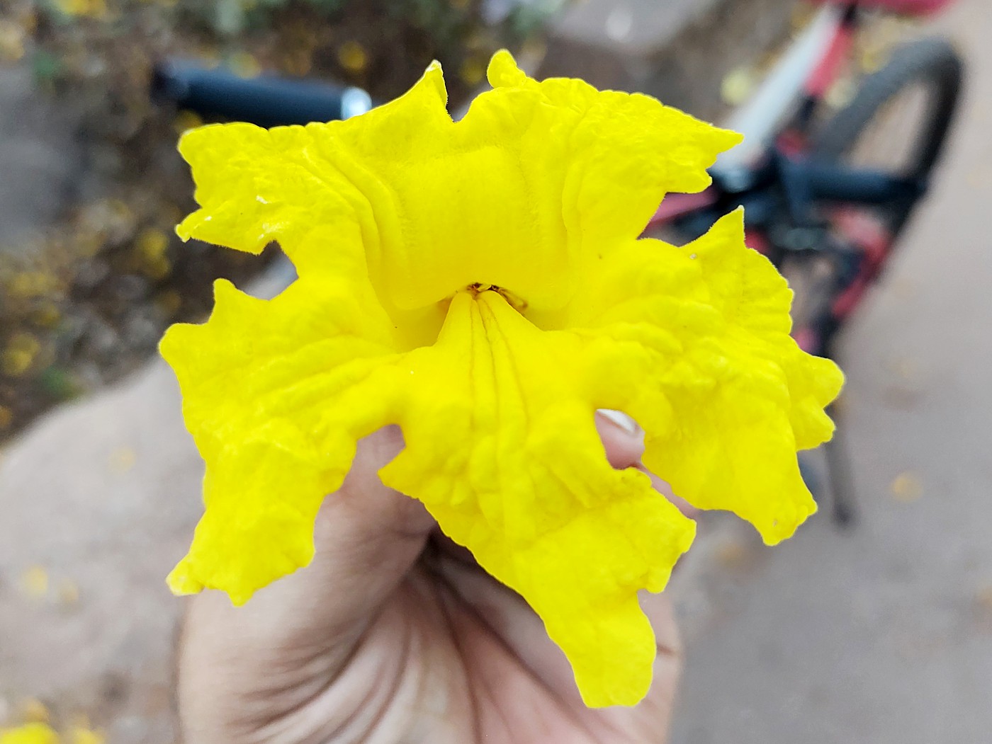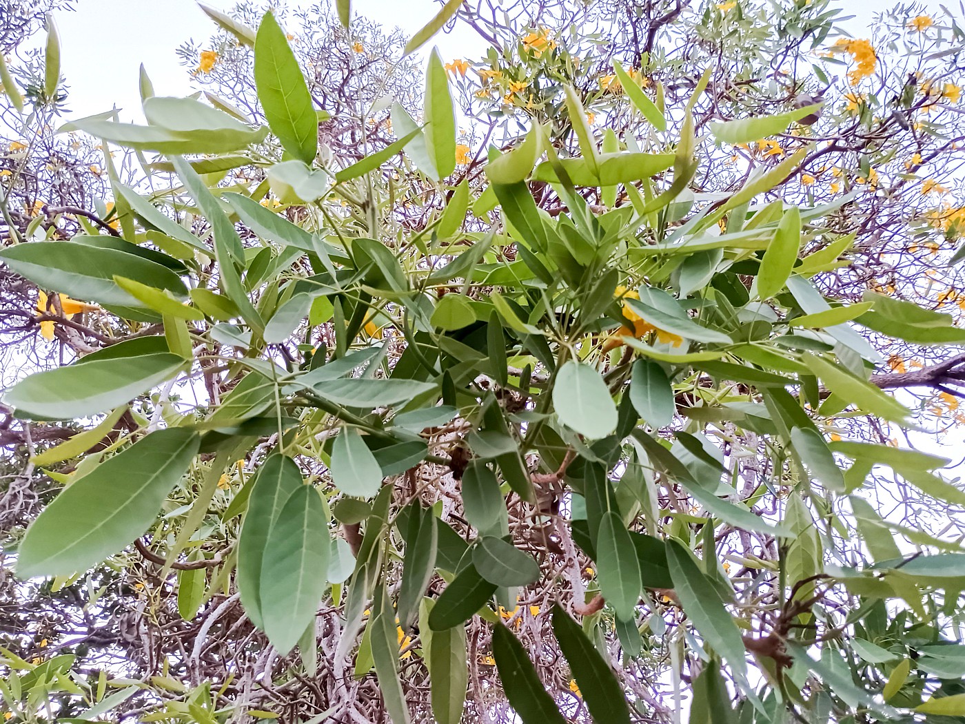 Growing to a height of about 8–12 metres, the tree possesses an elegance that extends beyond its flowers. Its bark is grey and slightly corky, while its palmately compound leaves carry a faint silvery sheen that inspired the name “Silver Trumpet Tree”. The crown is often irregular, with two or three dominant branches shaping its form. Even when not in bloom, the tree stands out for its slightly crooked trunk and attractive silvery foliage.
