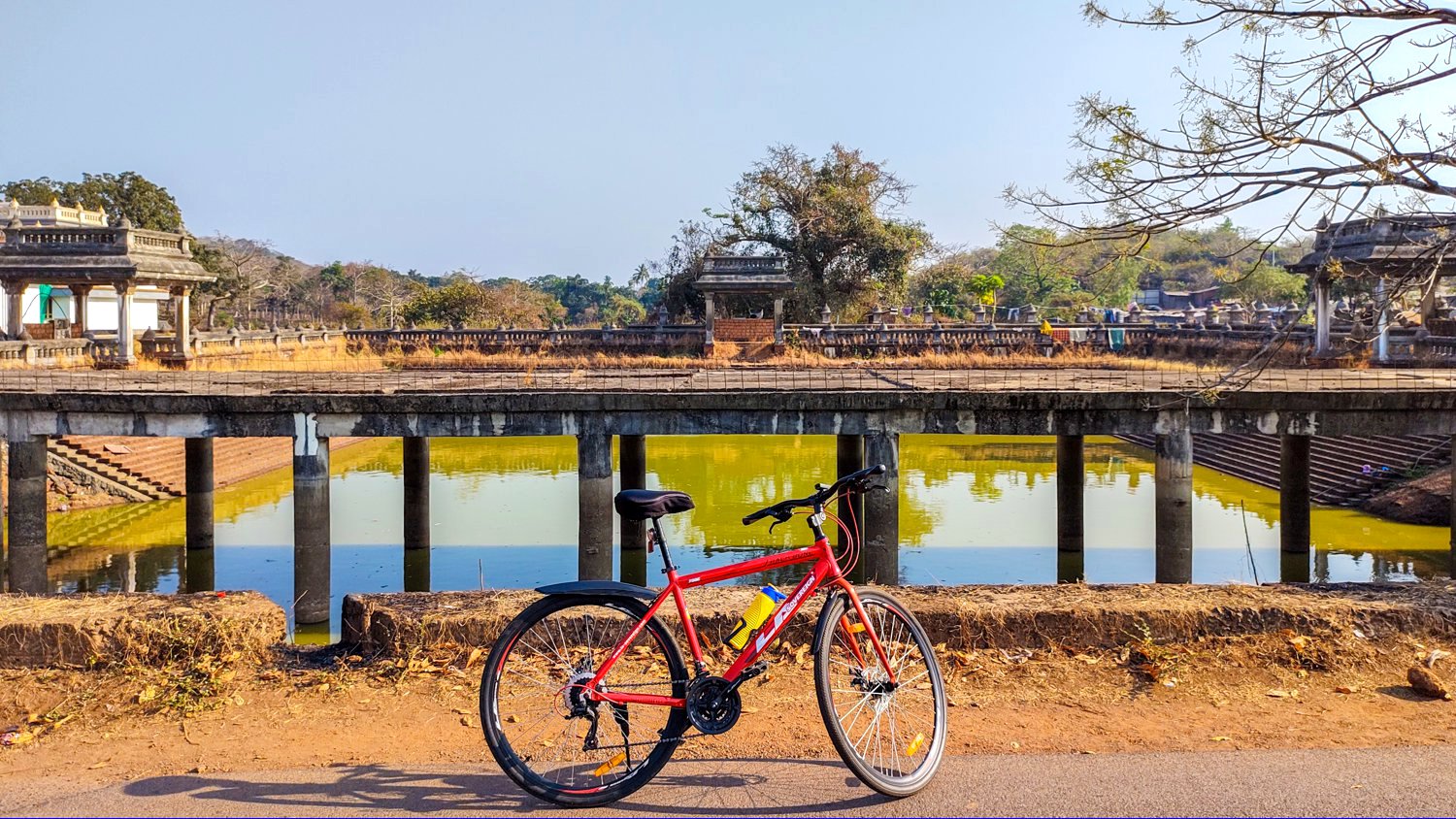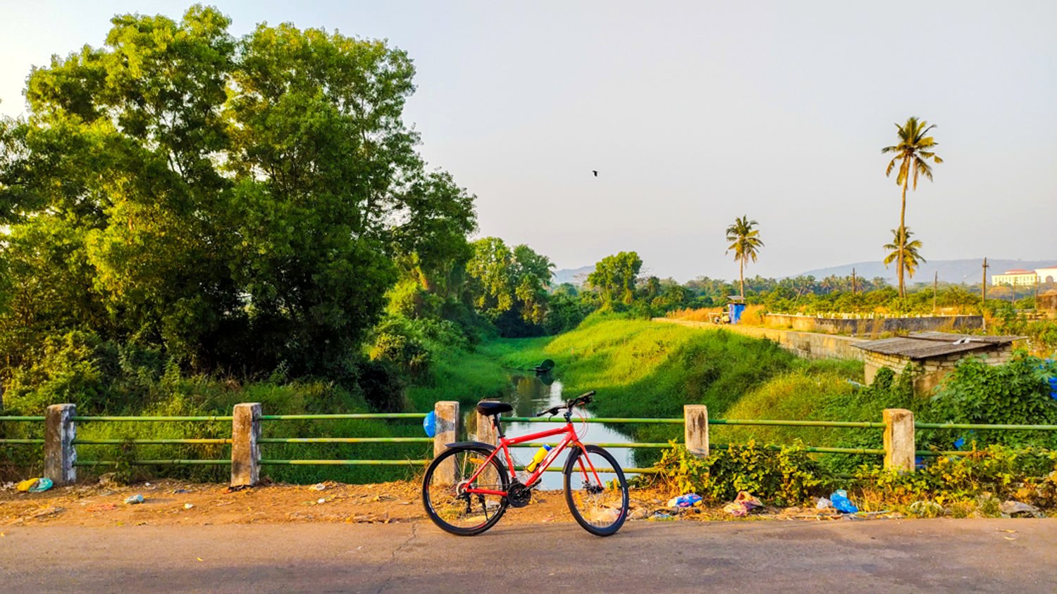 Pedalling through Madel leads to the bridge named after Erasmo Carvalho. This 52m long bridge was completed in 2005 after demolishing the old Portuguese era stone arch bridge. Unfortunately this part of the river is filled with weeds too.