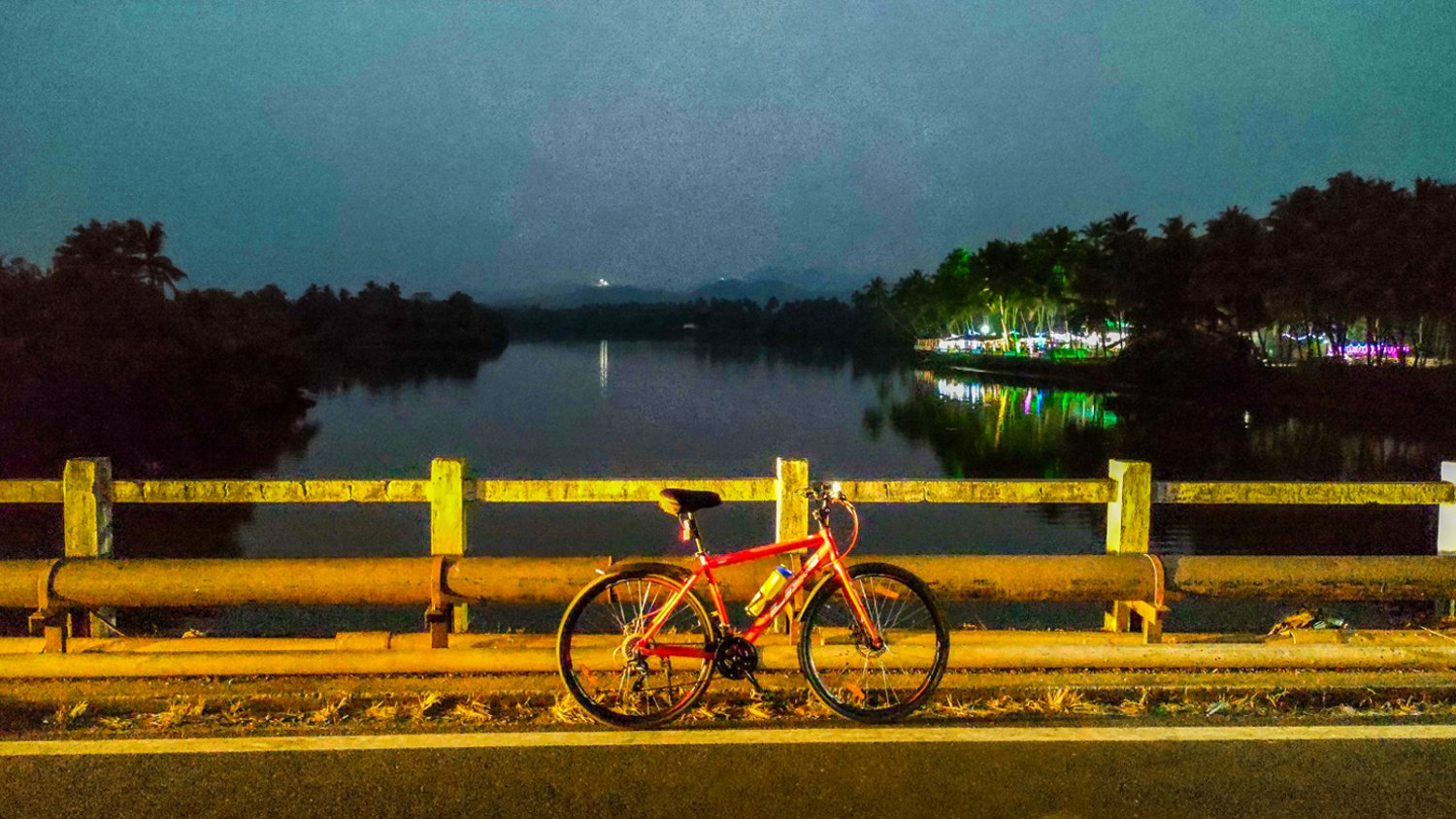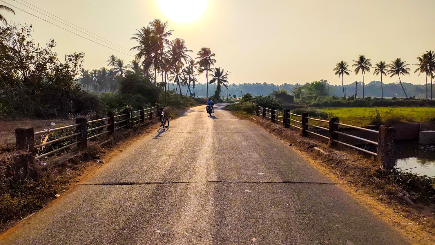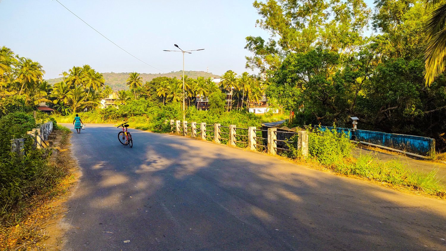 I ended the ride at the last point where the tarmac road ended with a view of the River Sal flowing into the Arabian sea, 49.2 km from the Verna plateau, the source where it originates. The end of the road is 700mts from Leela Resort from where the rotating light of the Betul Light House could be seen opposite the river bank.