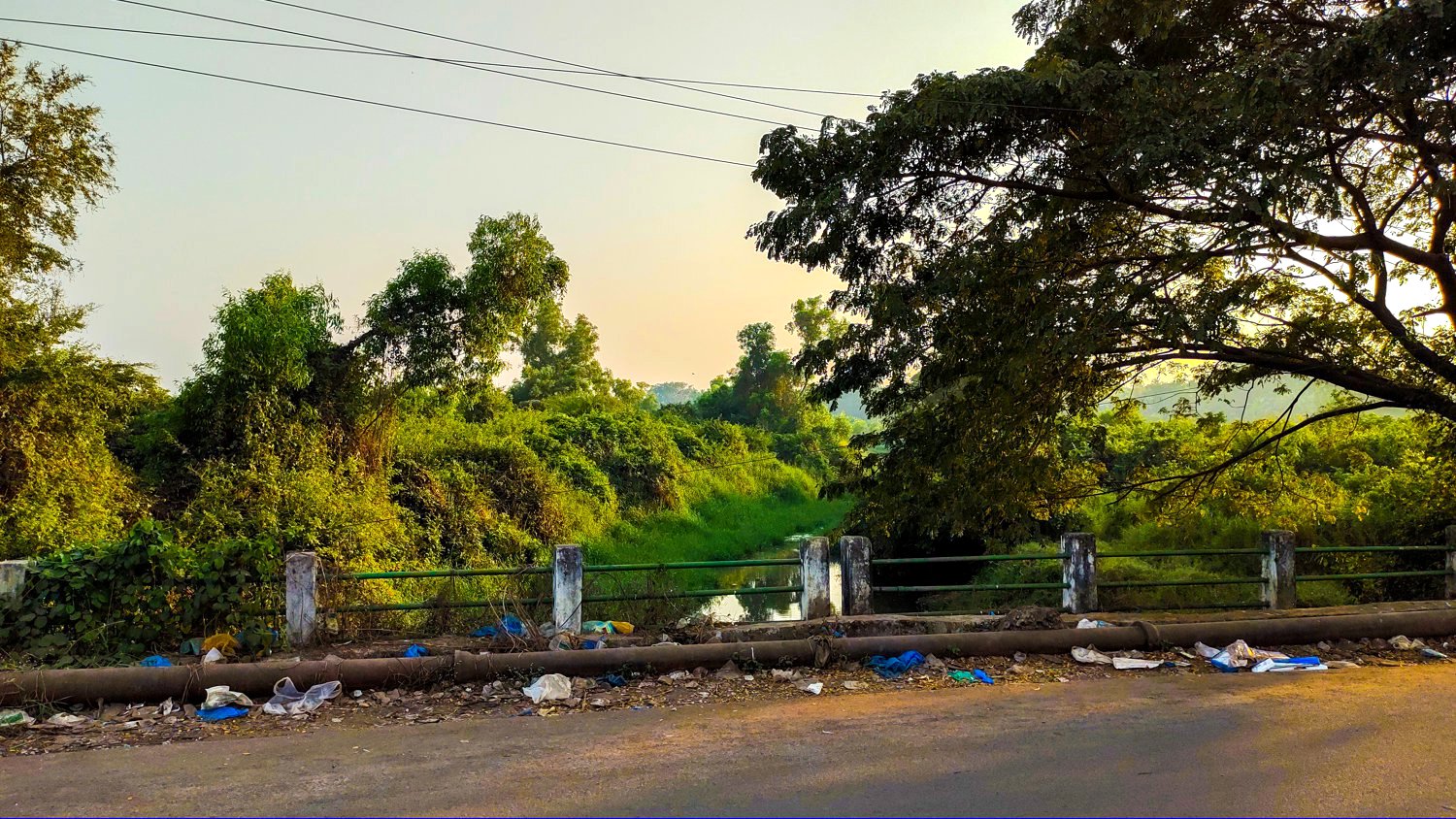 300 mts away is the bridge leading to the Margao Wholesale Fish Market where the river is polluted and filled with weeds, plastic bags and waste.